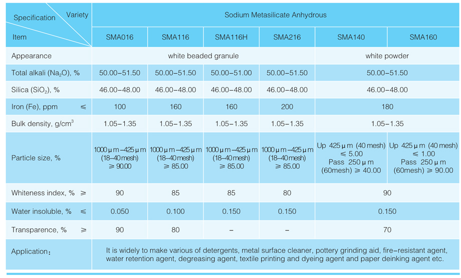 Standard compliance: HG/T 2568-2008 "Industrial Sodium Metasilicate",Enterprise Standard Q/0213DYP 001-2013 "Industrial Sodium Metasilicat".